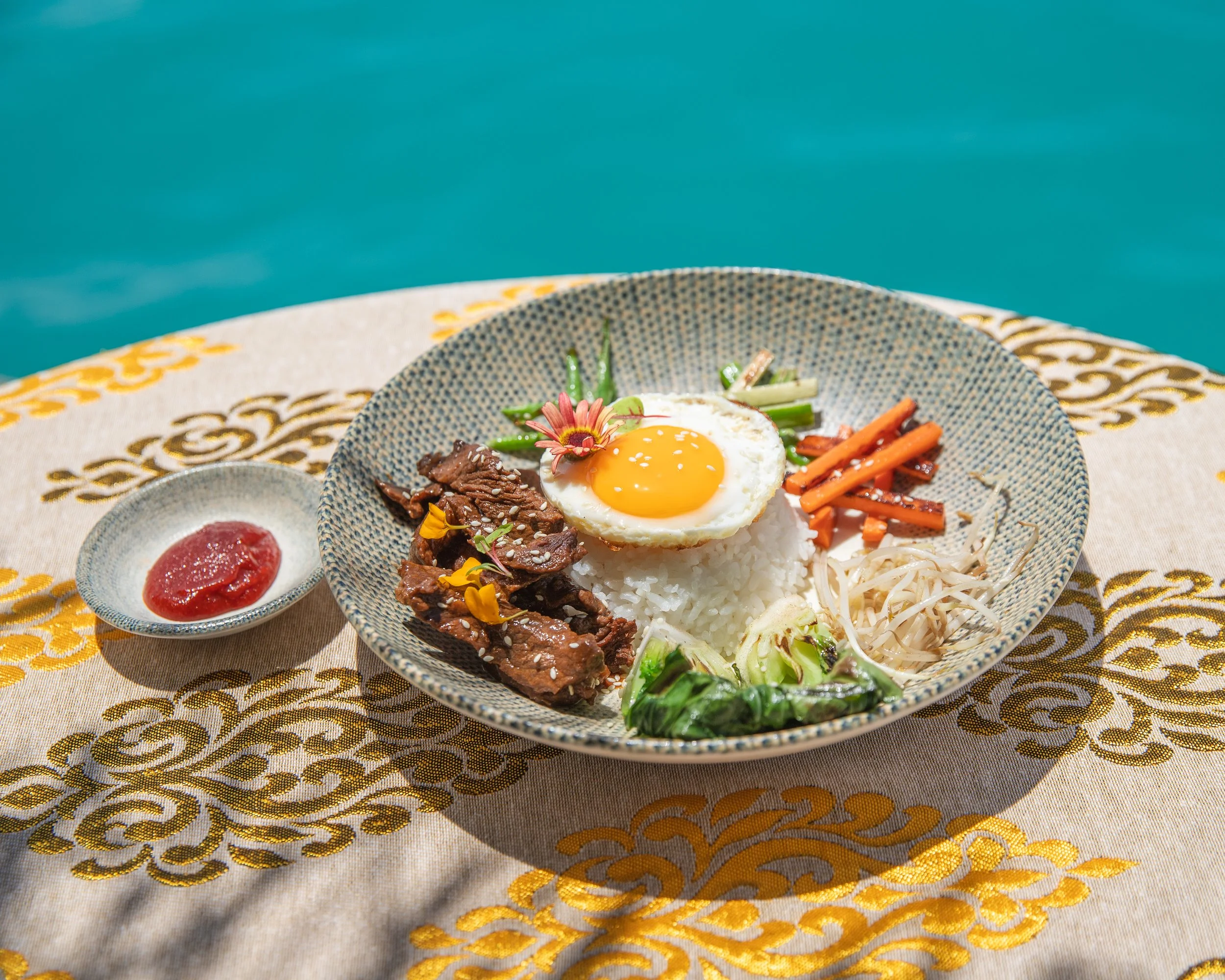 Корейское блюдо из риса с говядиной, овощами и жареным яйцом (глазунья)