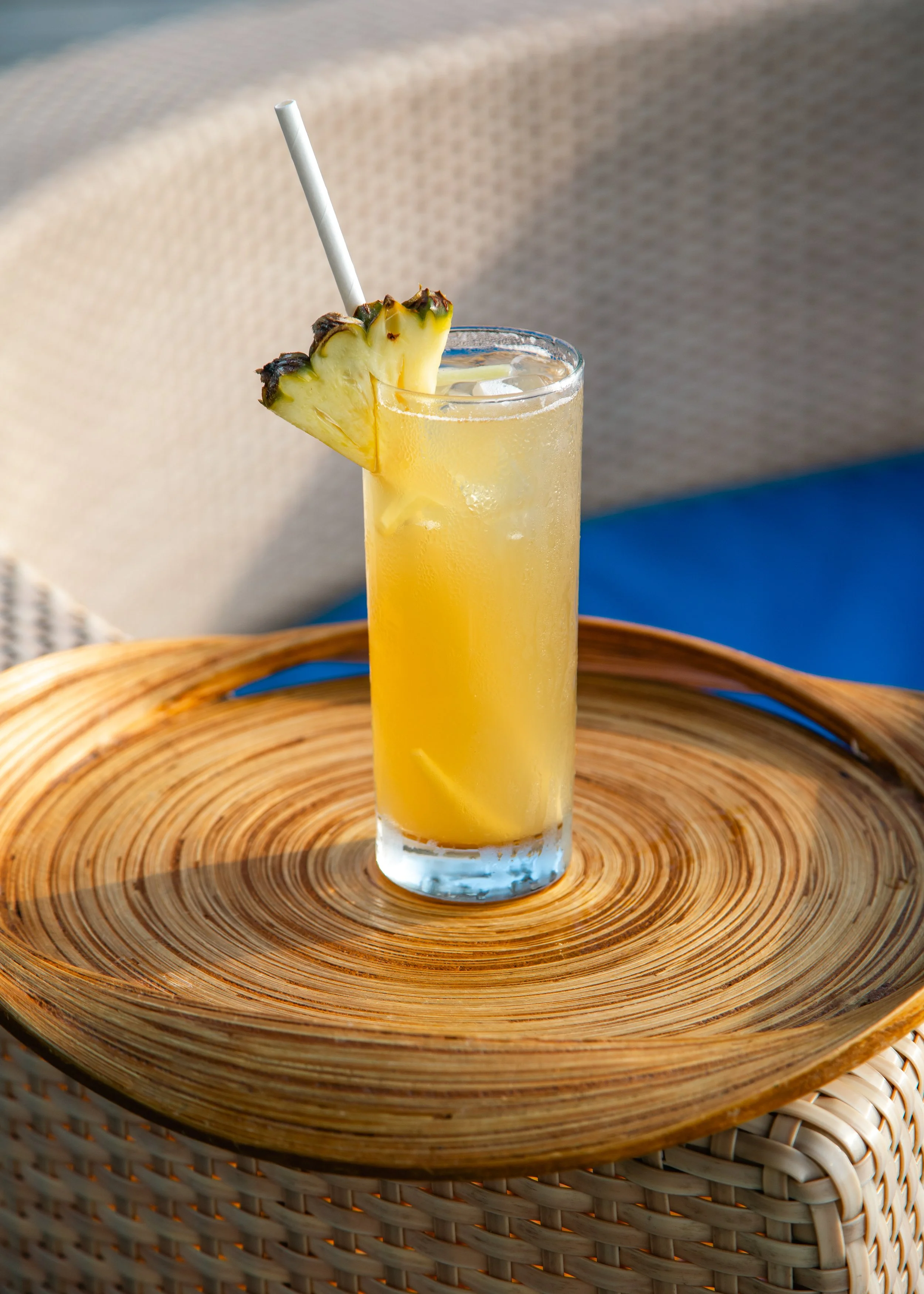 椰子朗姆、摩根船长香料朗姆、菠萝汁、石榴糖浆