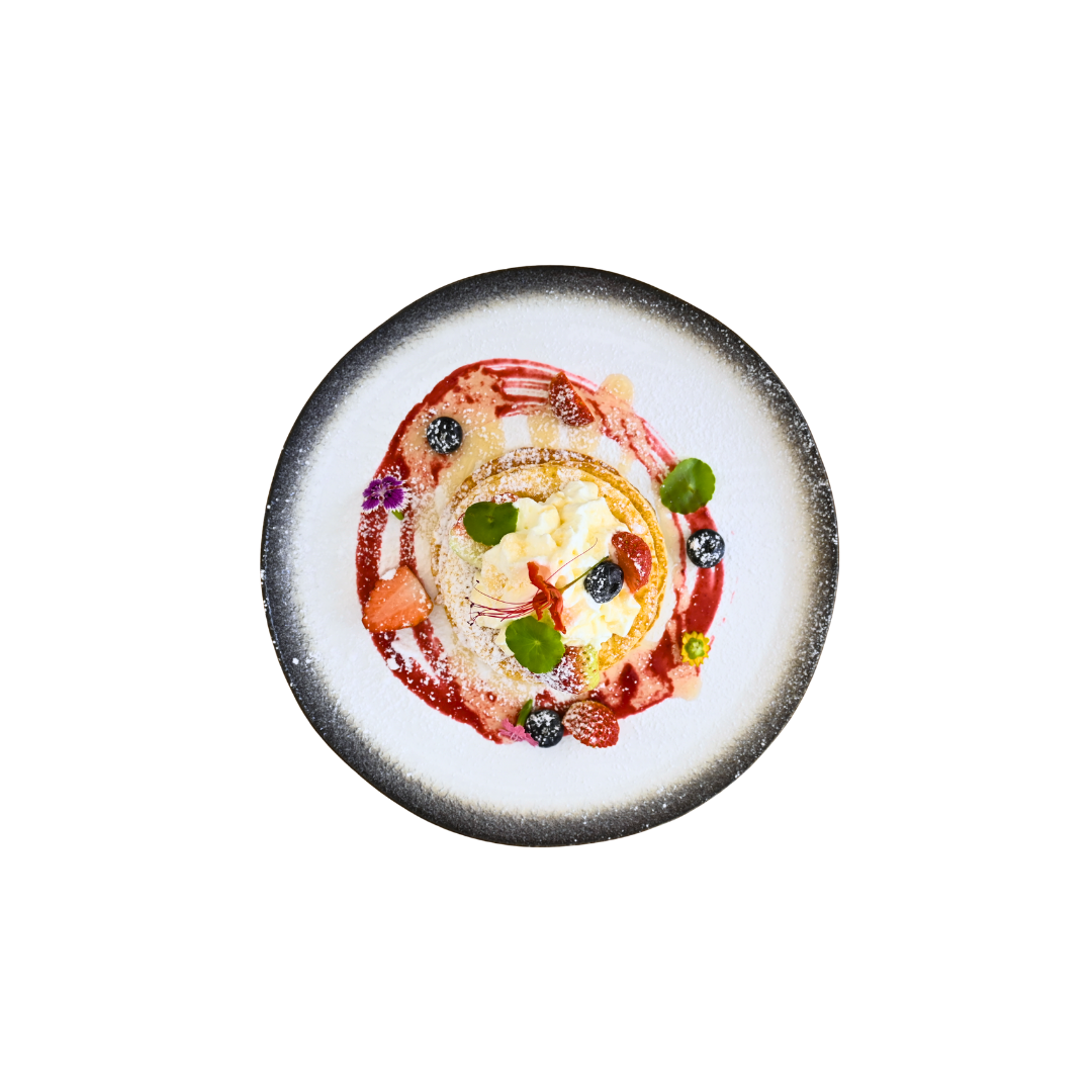 Fluffy Vanilla Pancake, Whipped Cream, Fresh Strawberries & Maple Syrup