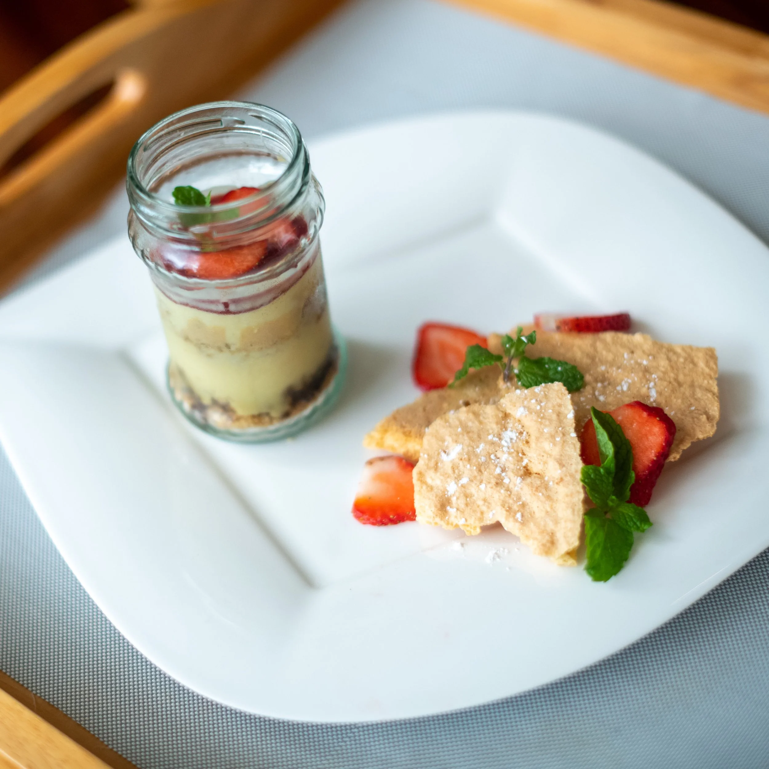 Served warm with sweet coconut cream, salted caramel ice cream and topped with fresh strawberries and jackfruit.