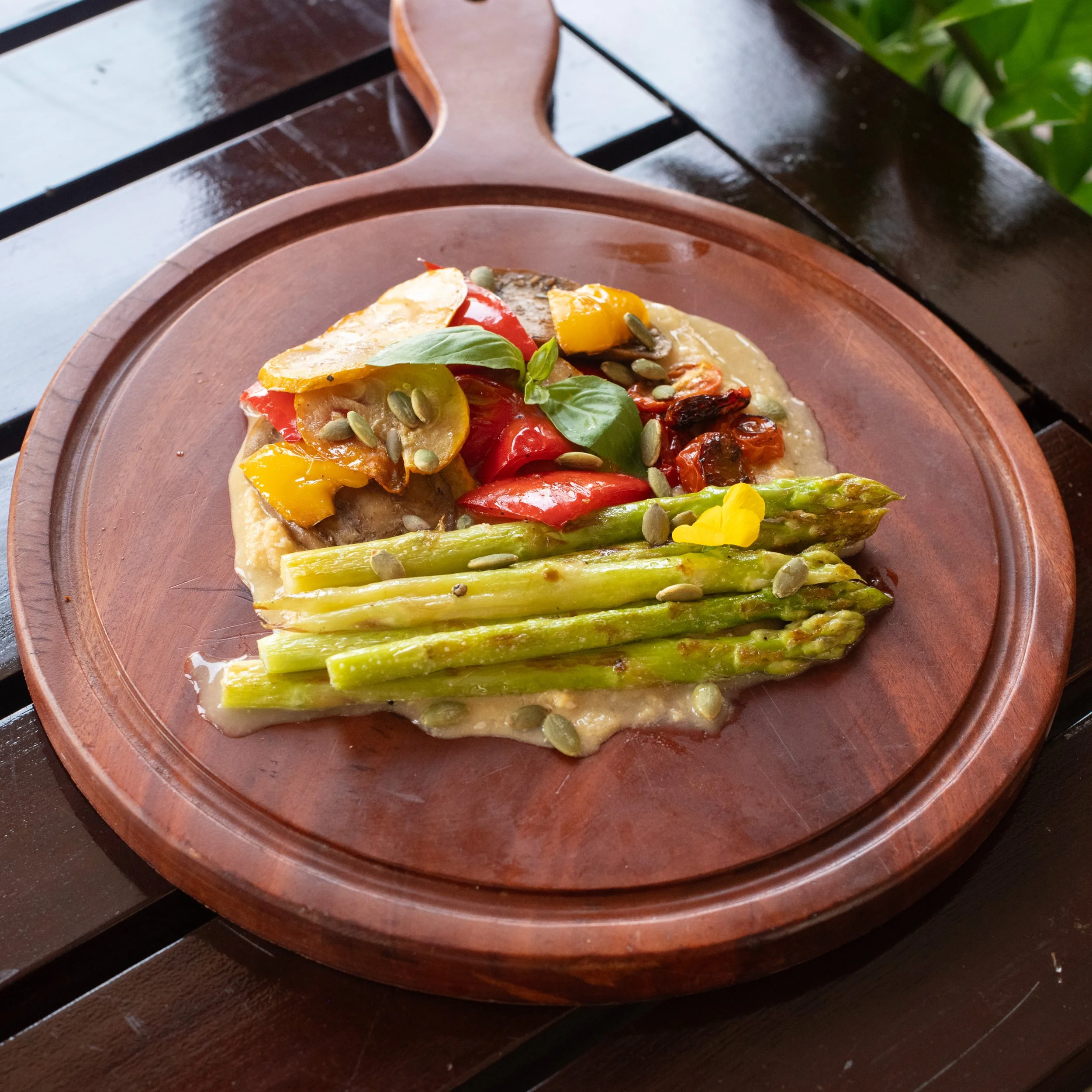Eggplant-Zucchini-Bell Peppers-Tomatoes-Asparagus-Hummus-Sesame